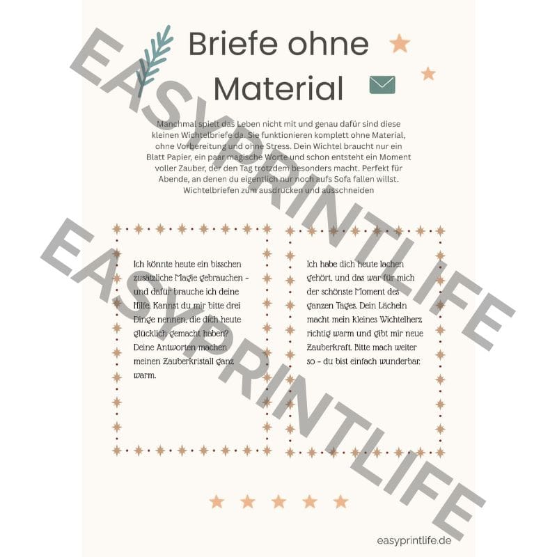 • Wichtelbriefe (Pausentage, Mini-Aufgaben, Komplimente) – Liebevolle, magische Texte für Tage, an denen du einfach keine Zeit hast oder der Wichtel „eine Pause“ braucht.